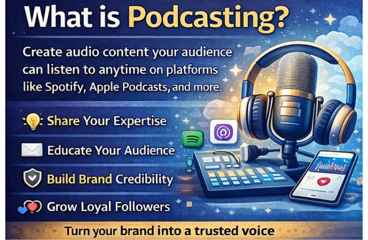 Podcasting is the process of creating and distributing audio content that people can listen to anytime on platforms like Spotify, Apple Podcasts, and Google Podcasts.
